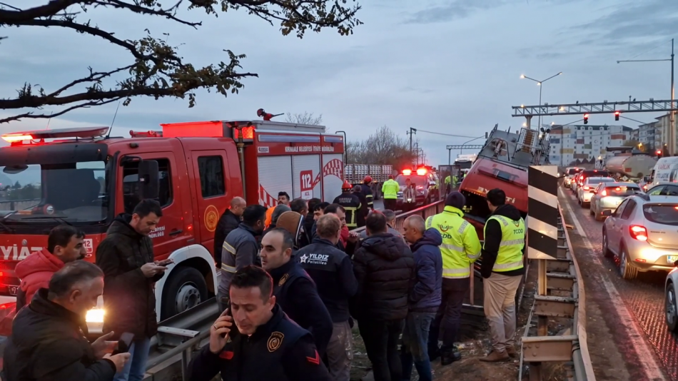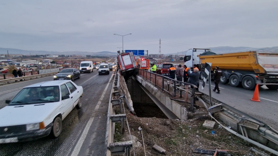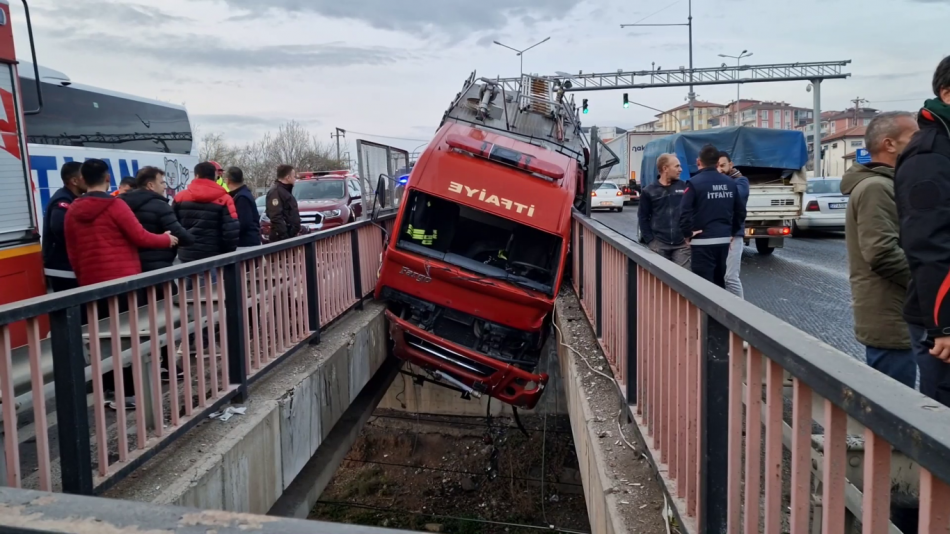 Seyir halindeyken lastiği patlayan aracın sürücüsü direksiyon hâkimiyetini kaybetti. Kontrolden çıkan itfaiye aracı, orta refüjdeki demir korkuluklara saplanarak köprüde asılı kaldı.