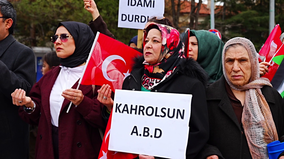 Ellerinde Türk ve Filistin bayraklarıyla birlikte “İdamlara, katliama, savaşa hayır” yazılı pankart ve dövizler taşıyan vatandaşlar, tekbir getirerek karara tepki gösterdi.