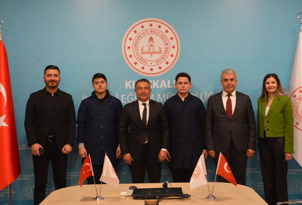 Kırıkkale Mesleki ve Teknik Anadolu Lisesi 11. sınıf Motorlu Taşıtlar Teknolojisi Alanı öğrencileri Efe Karataş ve Berat Ocak, Okul Müdürü Çetin Yıldız, AR-GE Birim Sorumlusu Mustafa Can Hiçyılmaz, Erasmus + Mesleki Eğitim Proje Koordinatörü Melike Sevde Kaplan ile birlikte hareketlilik öncesinde Millî Eğitim Müdürü Güney’i ziyaret etti. Ziyaret sırasında öğrenciler, Almanya’da gerçekleştirecekleri staj programına ilişkin bilgi vererek yaşadıkları heyecanı paylaştı.